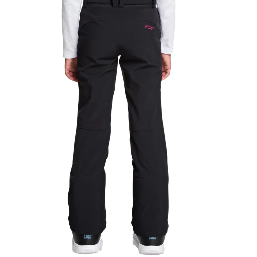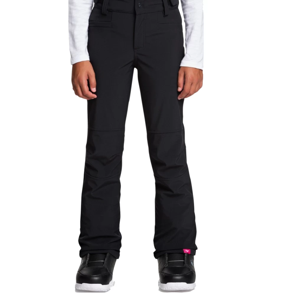 ROXY – Snow Creek Girl Pant. Pantalone da Snowboard da ragazza 8-16 anni con taglio skinny nero, ideale per completare i tuoi look su pista. Tag del brand rosa a contrasto.